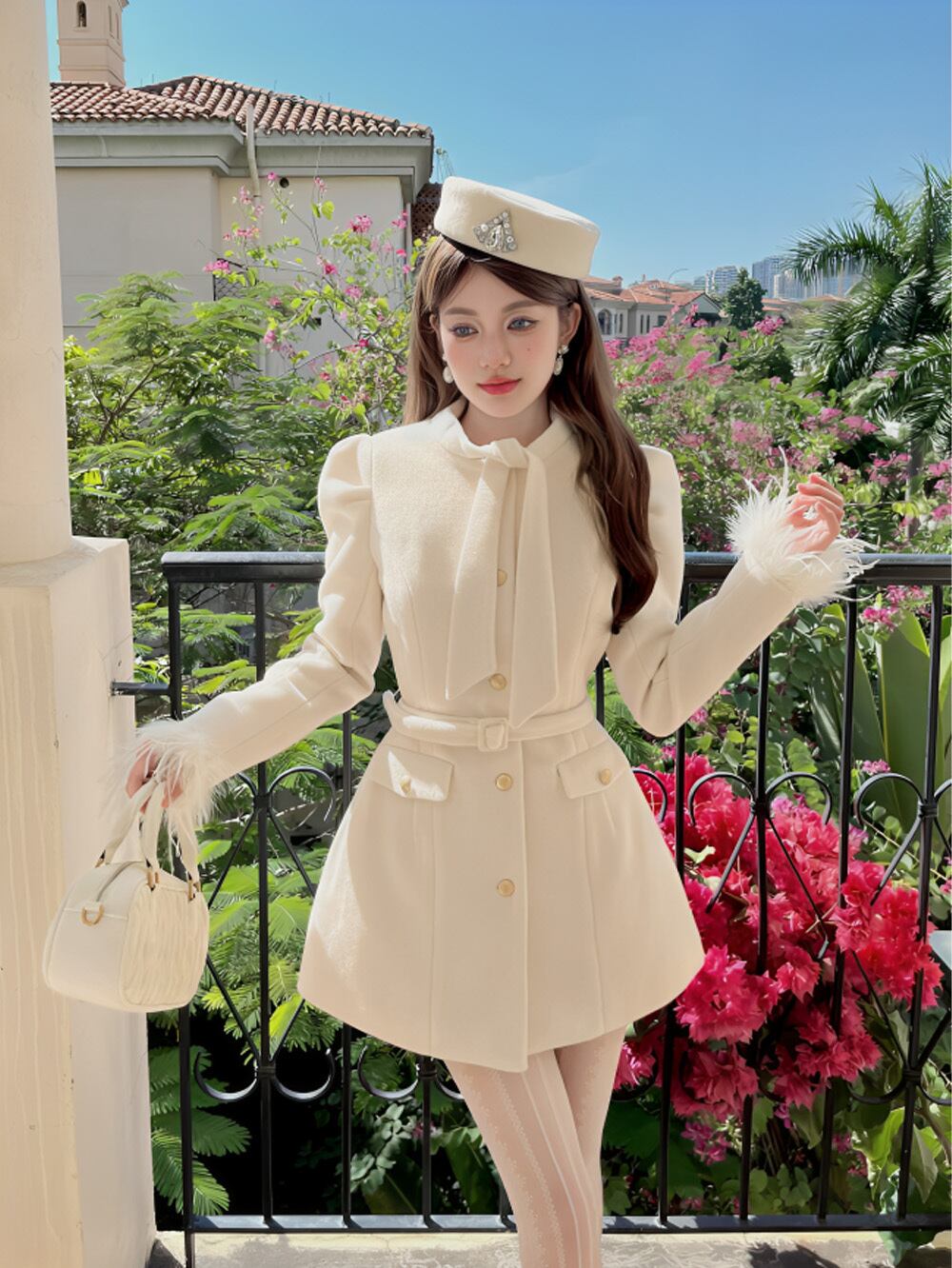 フリンジスリーブベルテッドネックタイアウターミドルコートは、きれいめで大人可愛いミドル丈コートのアイテム。