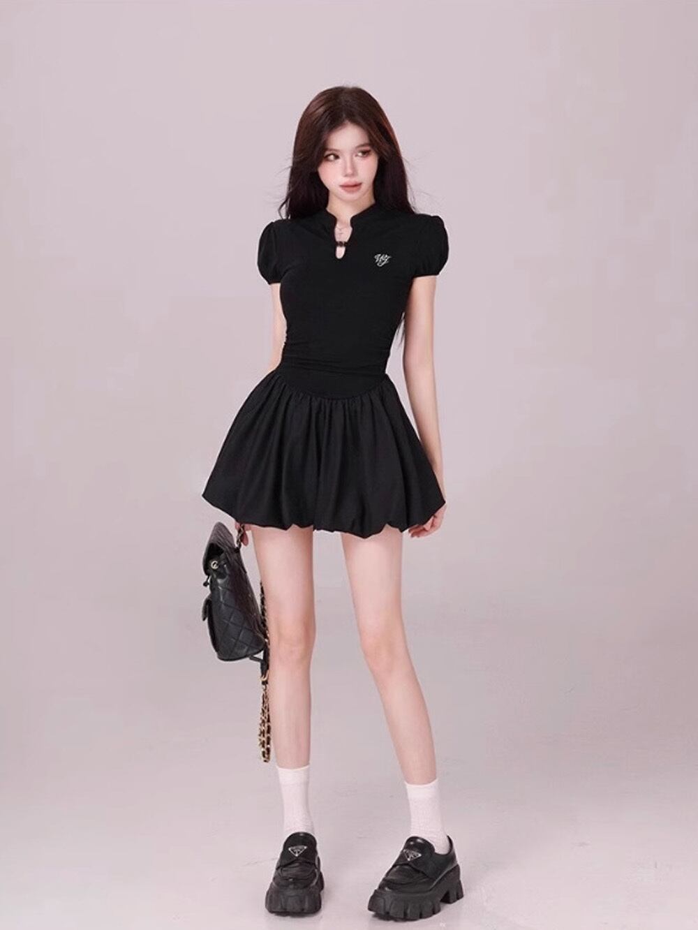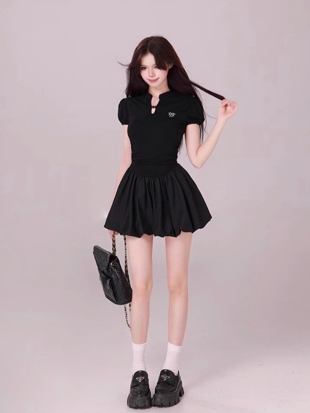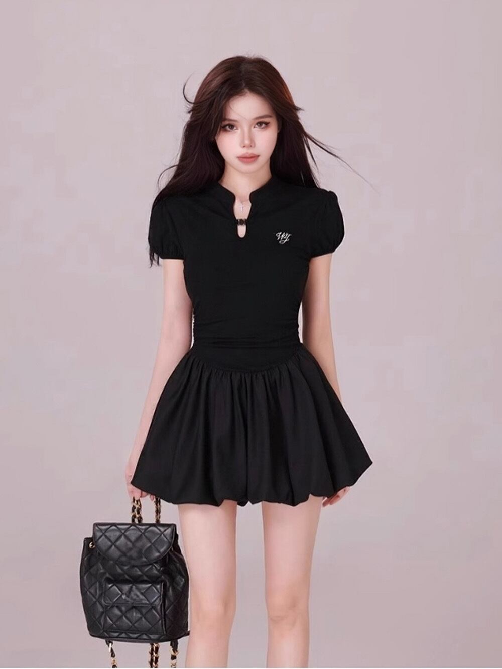 パフスリーブのデザインが、華やかさを演出しつつ、スリットが施されたミニ丈が女性らしいラインを美しく引き立てます。軽やかな素材感で、これからの季節にぴったりな一着となっており、リラックスした雰囲気を醸し出します。