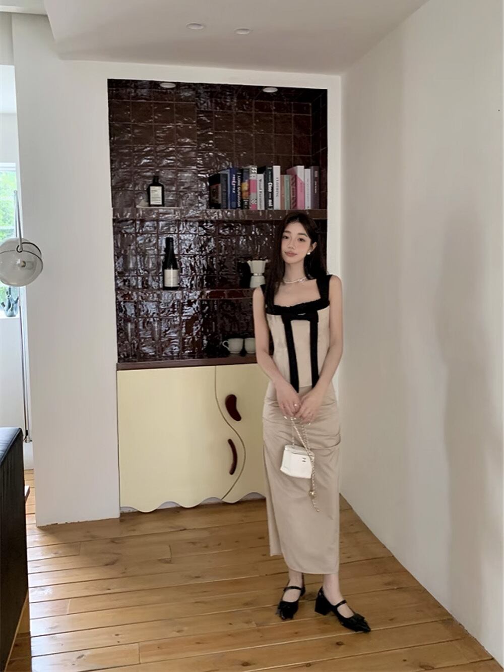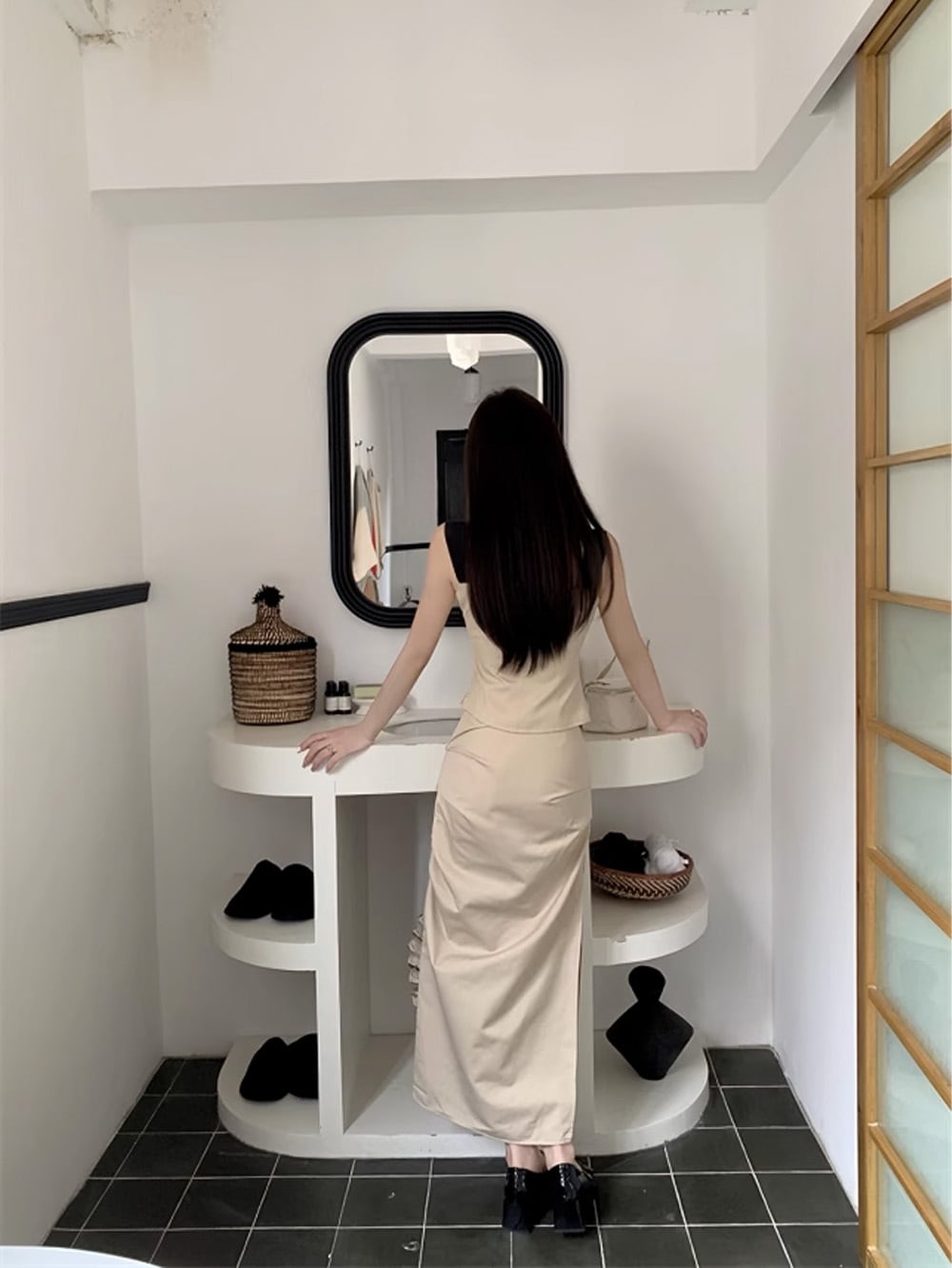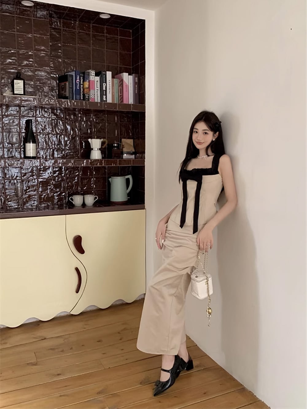 上品なキャミソールに合わせたスカートは、動くたびにしなやかに揺れ、コーディネートを一層引き立てます。