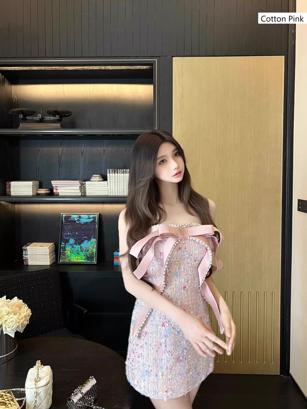 生地はほんのりツイード調で、淡いピンク、そしてブラックの色合いが大人っぽさと可愛らしさのバランスを絶妙に演出。