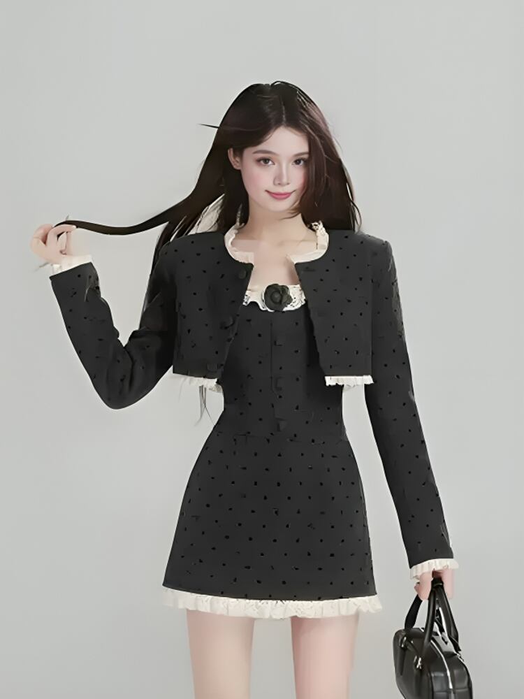 ドットデザインレースカメリアブローチセットアップは、クラシカルなルックスと大人可愛いデザインを融合させたアイテム。