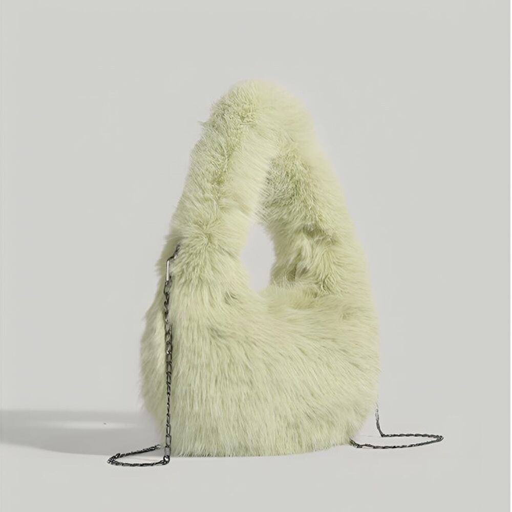 ミドルサイズのコンパクトなデザインは、普段使いしやすく、持ち運びも楽々。ファーの柔らかい質感と、メタリックなチェーンが絶妙なバランスを生み出しています。