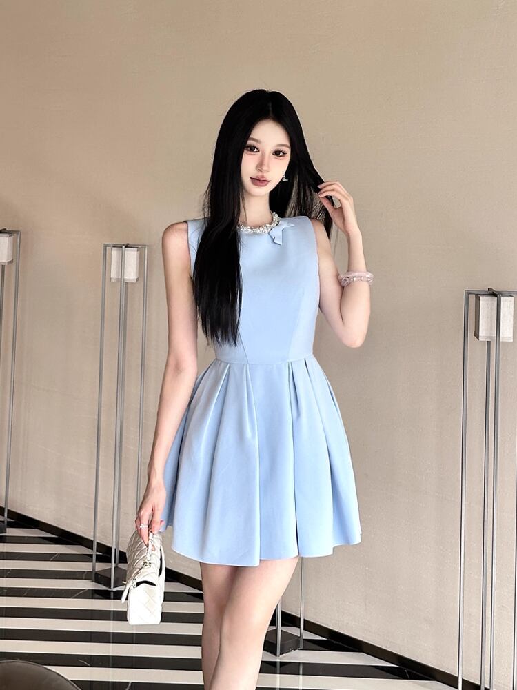"洗練されつつ可愛らしさを演出するデザイン"、それがネックビジューミニマムリボンアタッチプリーツノースリーブワンピースの魅力。この素敵な一着をお楽しみください♡