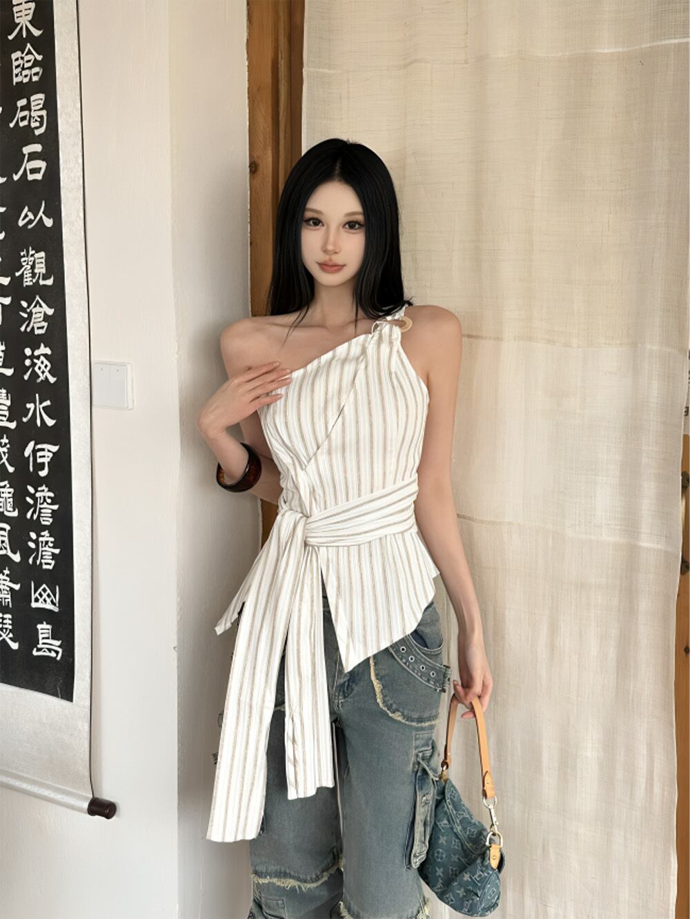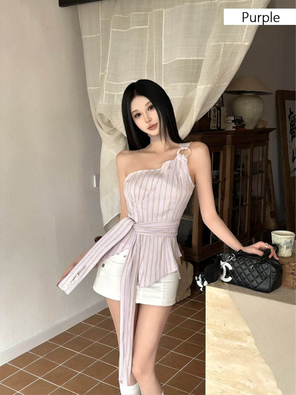 ストライプウエストベルテッドワンショルダートップスで、あなたの個性とおしゃれを引き立てるスタイルを楽しんでください♡