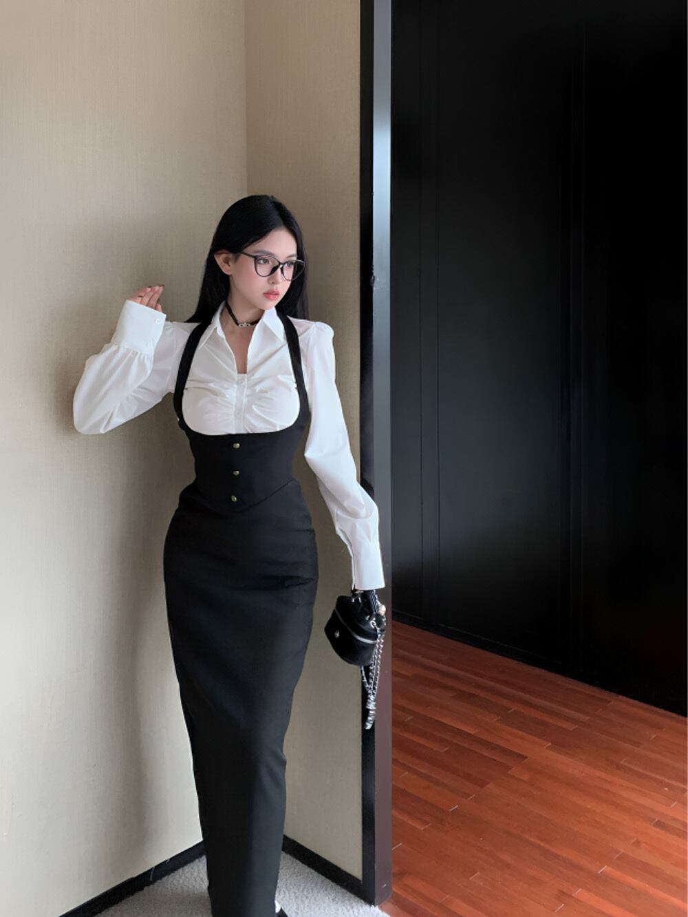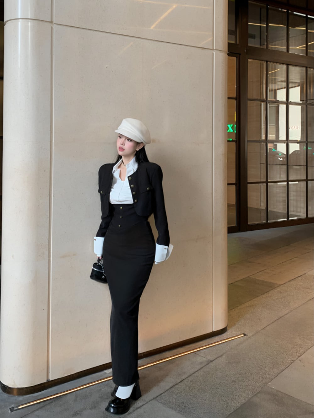 クロップドジャケット&シャツ+サスペンダーワンピーステーラードセットアップは、フォーマルスタイルでありつつも、大人可愛いを実現させた新感覚のアイテム。