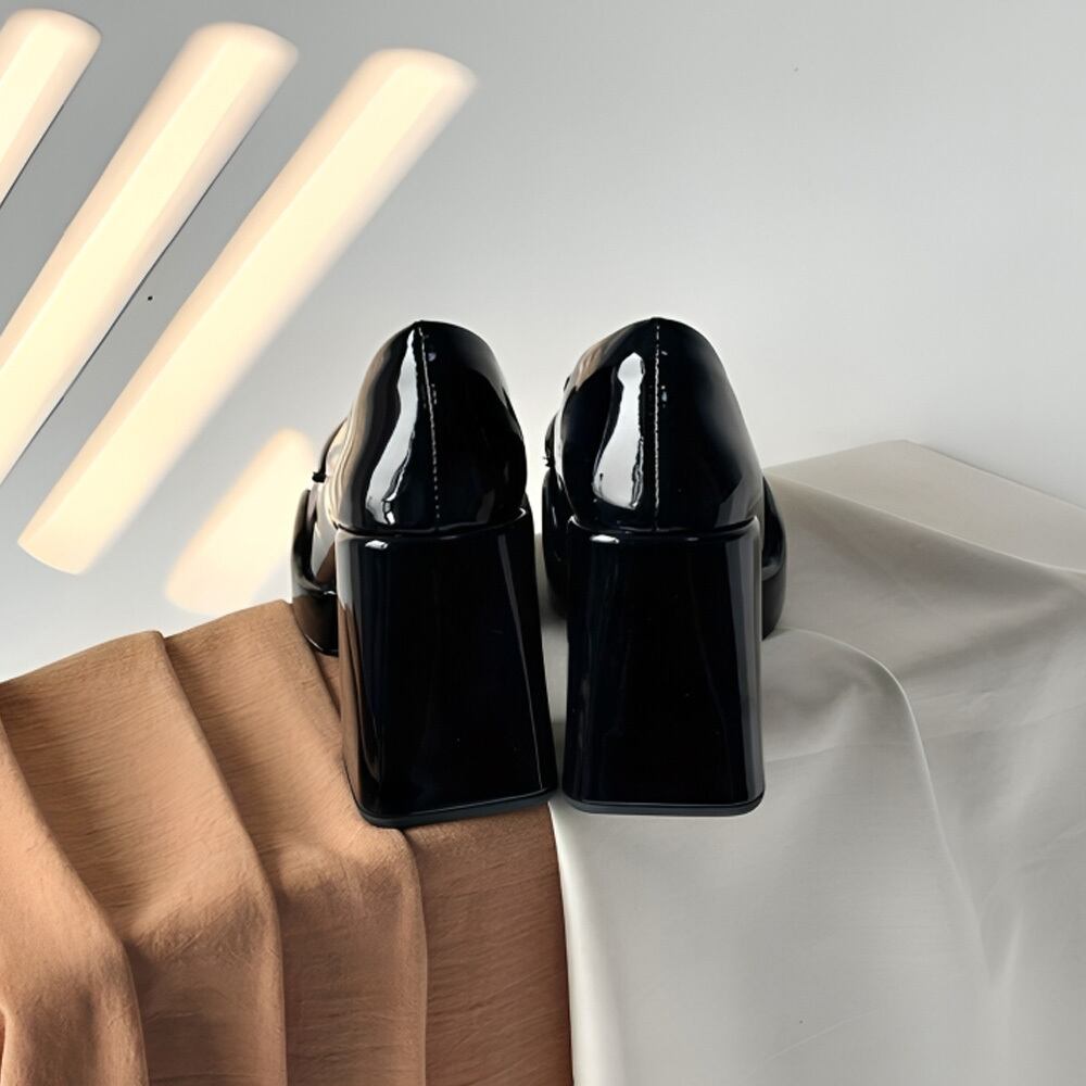 光を浴びて輝くエナメル素材が、どんなスタイルにも華やかさをプラス。モダンとクラシックが調和するチャンキーヒールデザインが、シンプルな装いにも確かな存在感を。