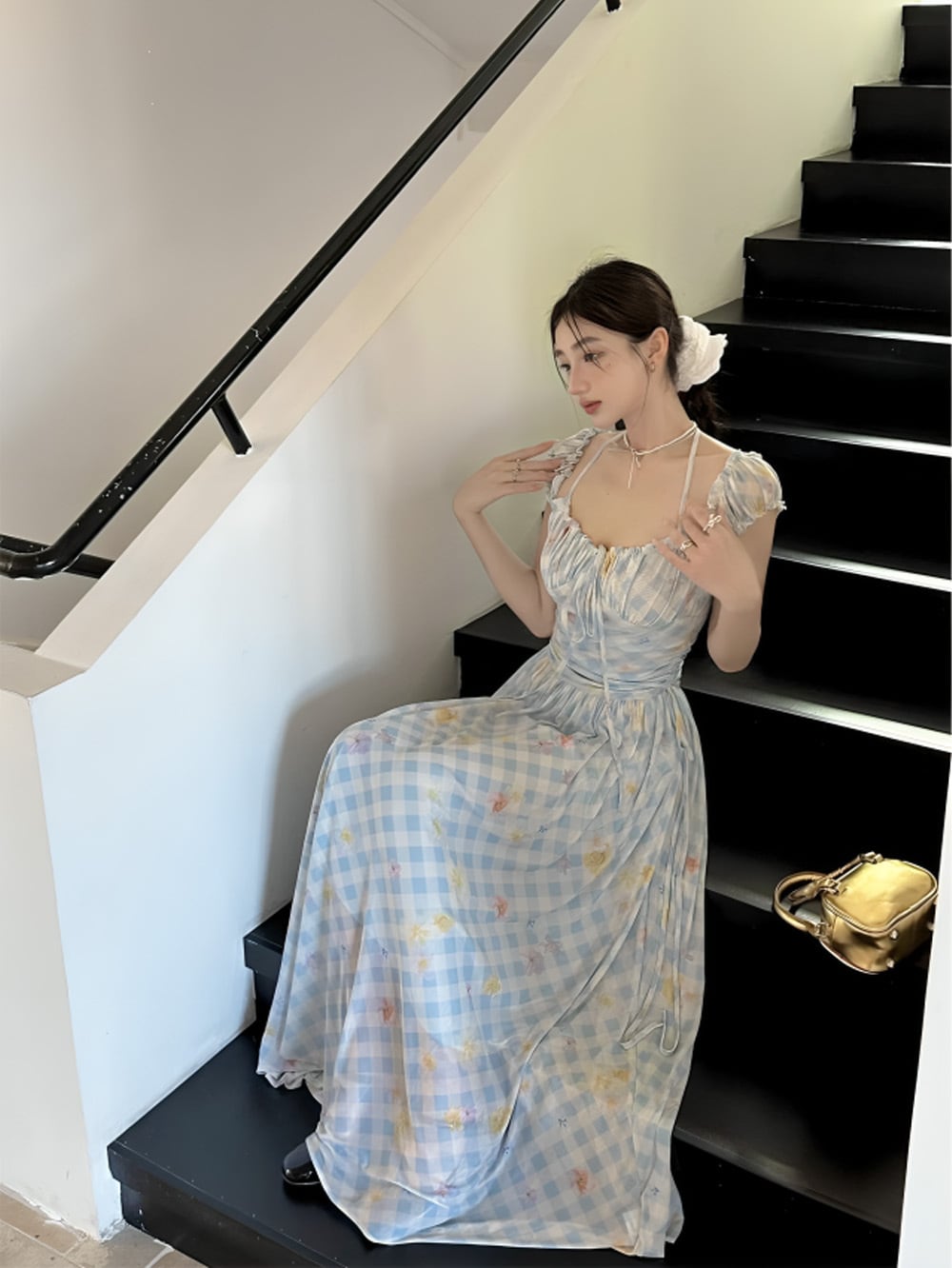 "華やかさと爽やかさを兼ね備えた"コードアセンブルブルーチェックフラワーアートワンピースをお楽しみください♡