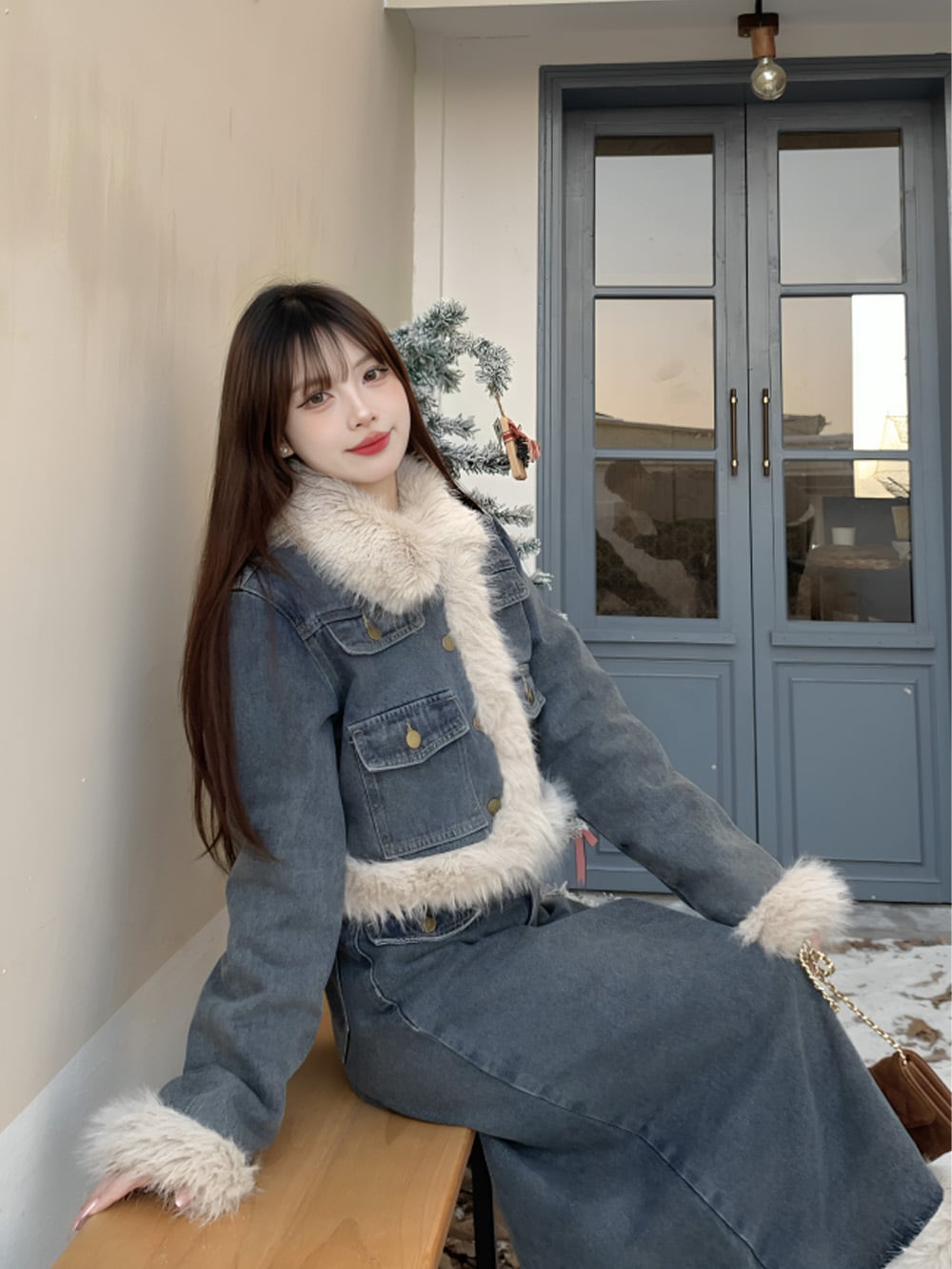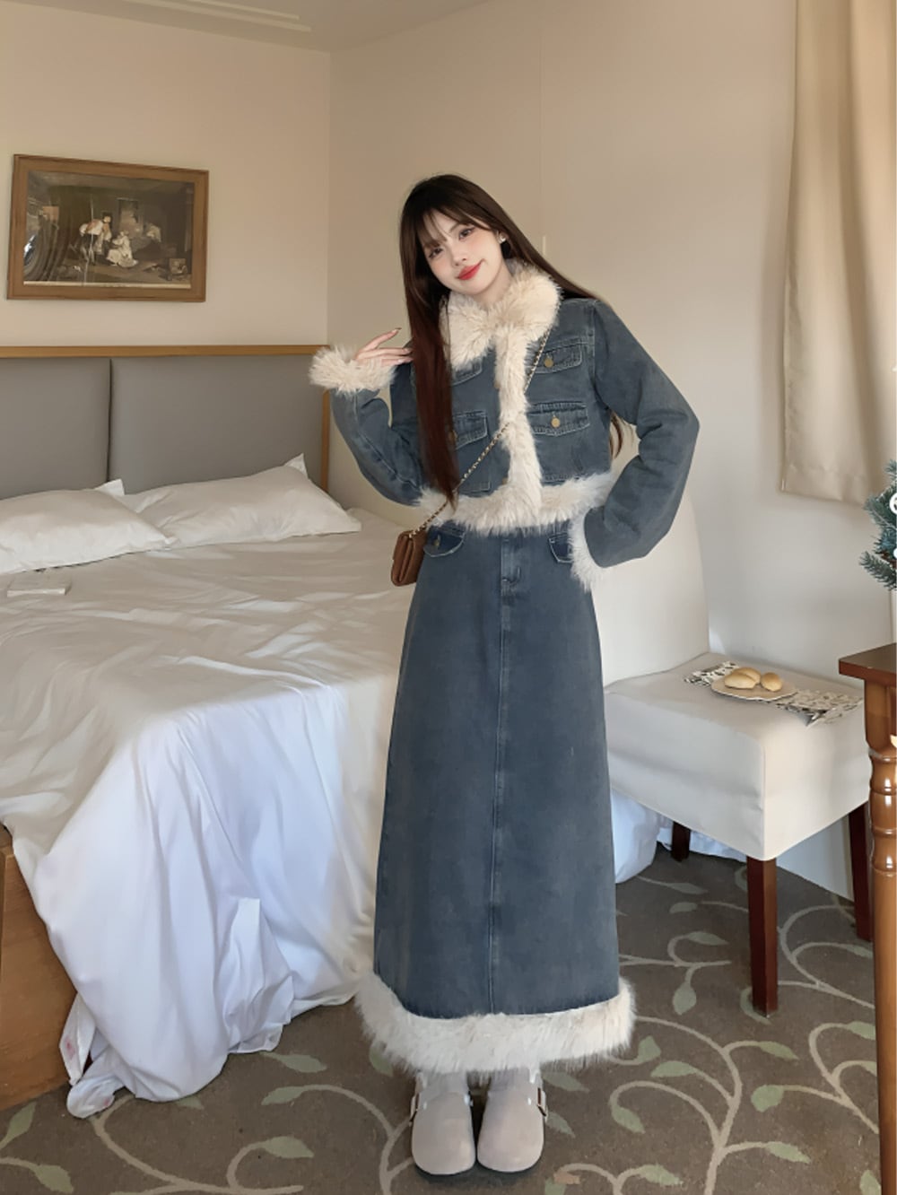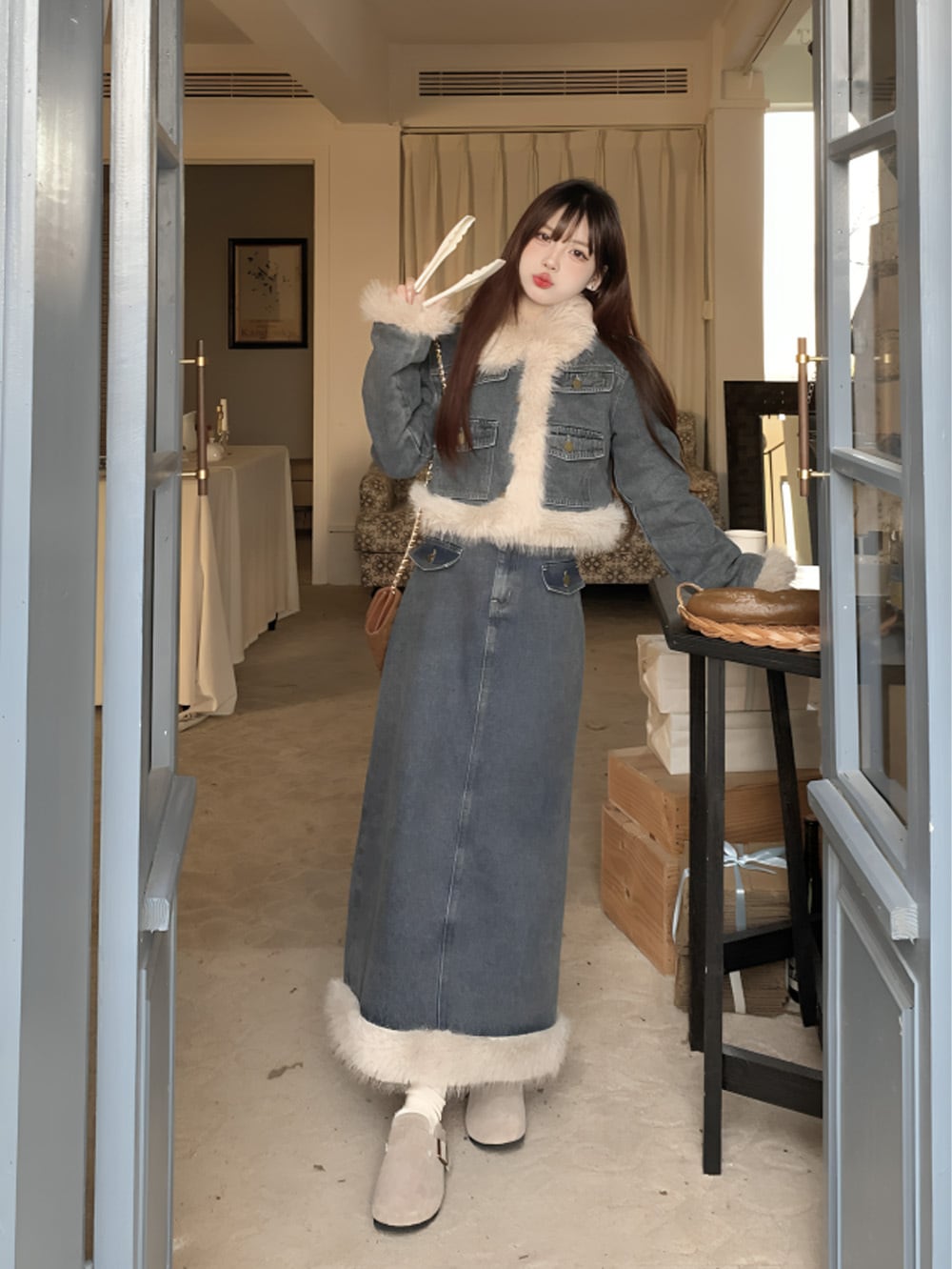ポイントファーデザインロング&ショートデニムセットアップは、デニムのカジュアルな雰囲気に、ファースタイルの豪華な印象を組み合わせた新スタイルのアイテム。