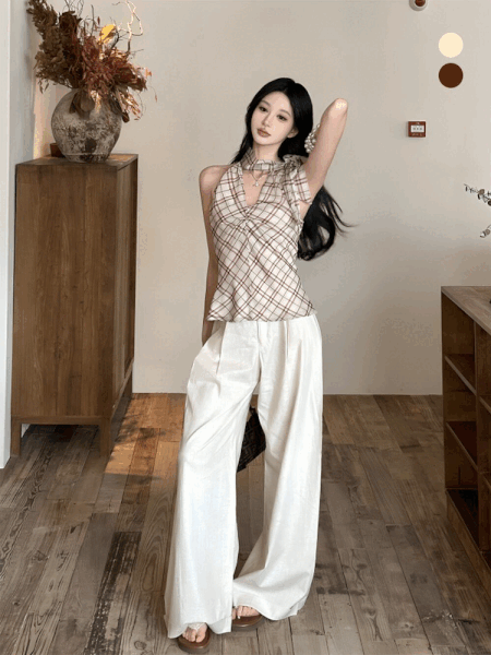 おしゃれで快適な着心地をご体験いただけるネクタイコードチェックスタイルノースリーブトップスをお楽しみください♡