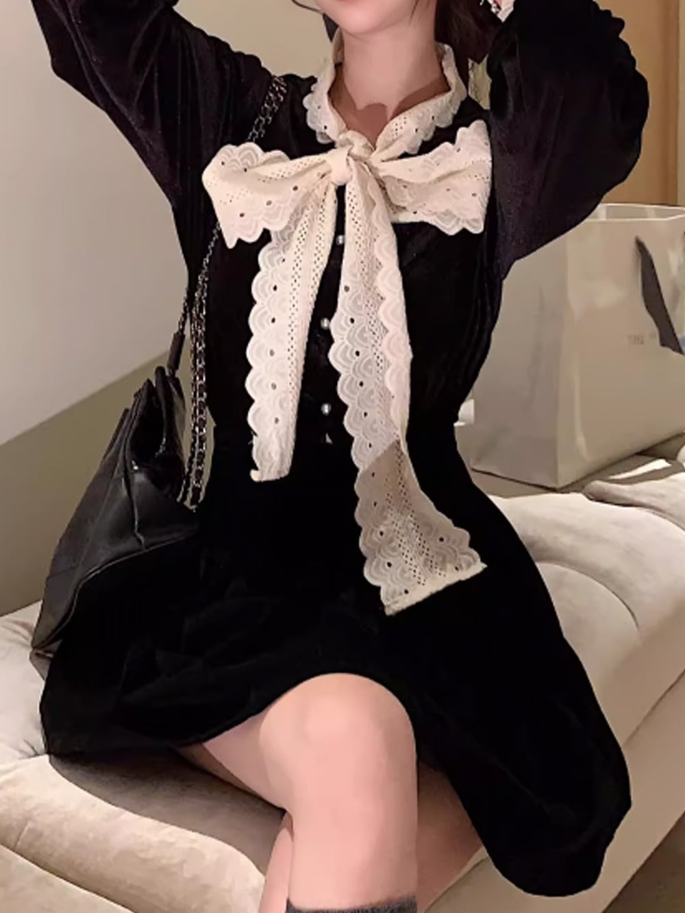 ふんわりとしたリボンデザインが、女性らしさを引き立てるトップスと、ミニ丈のブラックスカートが絶妙に組み合わさった魅力的なセットアップ。肌触りの良い素材を使用しているため、快適な着心地を実現しています。