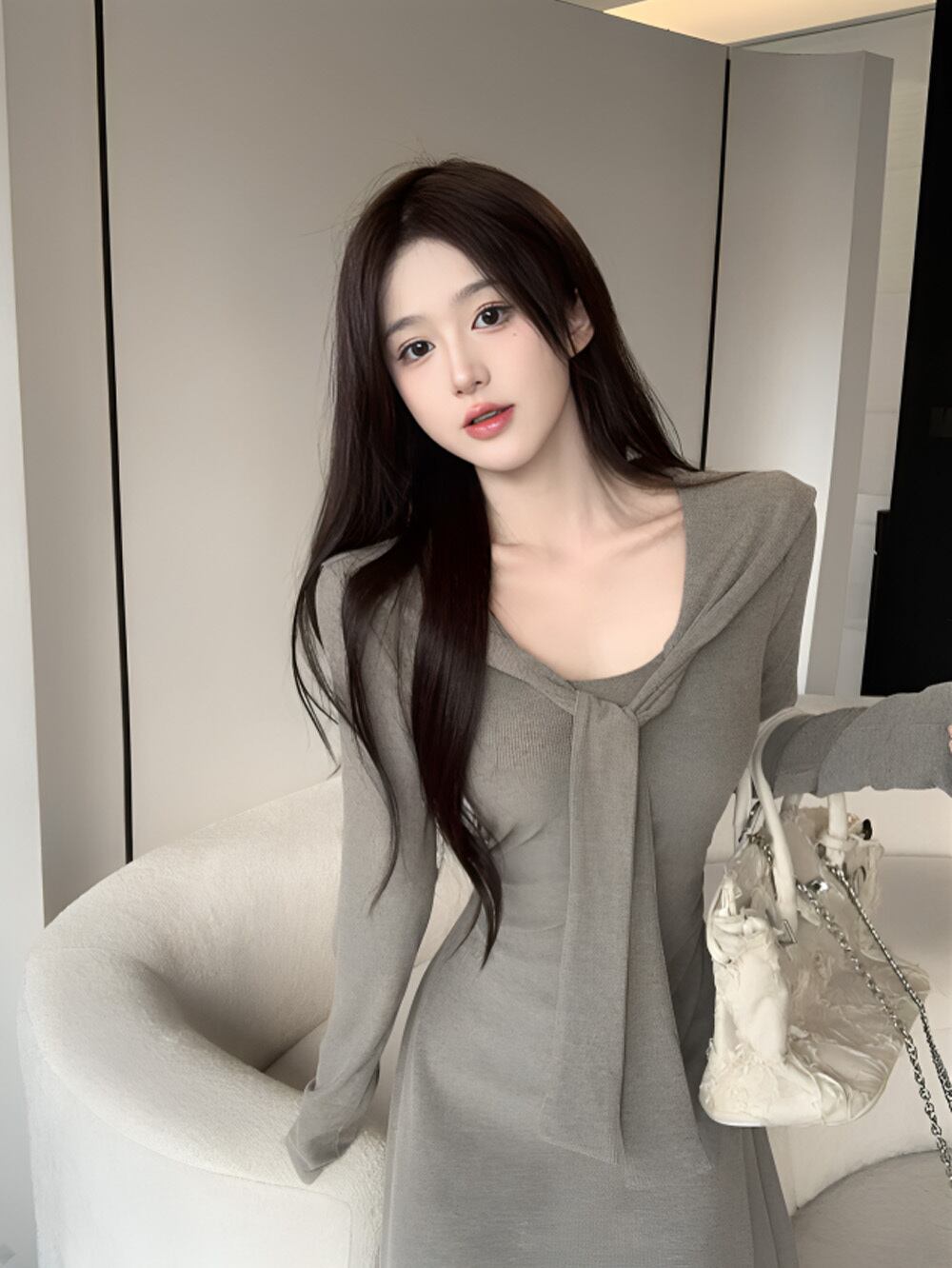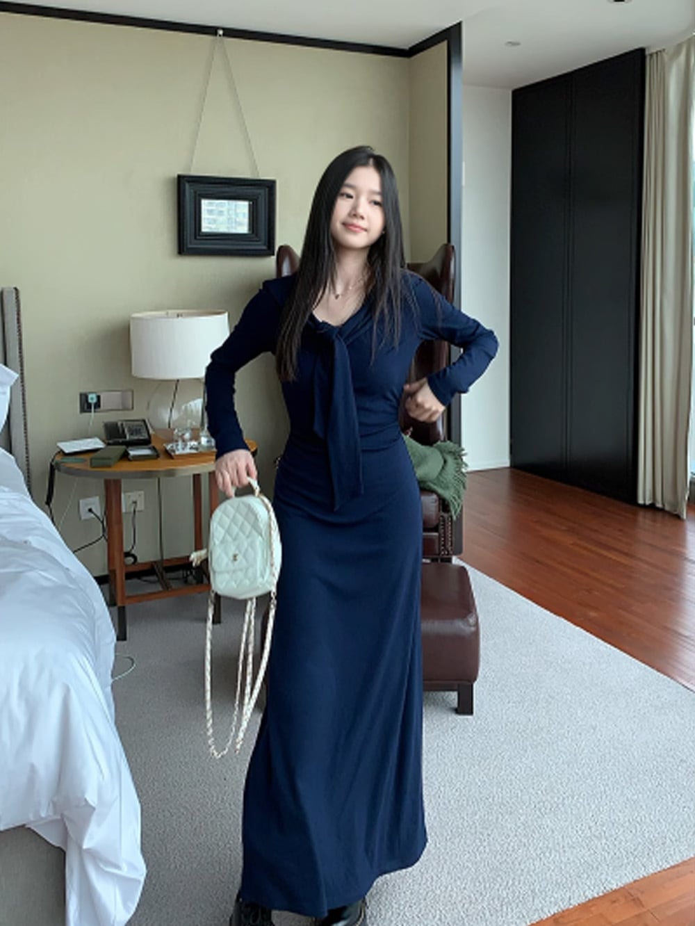 フロントで結ぶタイデザインがワンピースにアイコニックなイメージを演出し、スタイルにクラシックかつモダンな印象を与えます♪