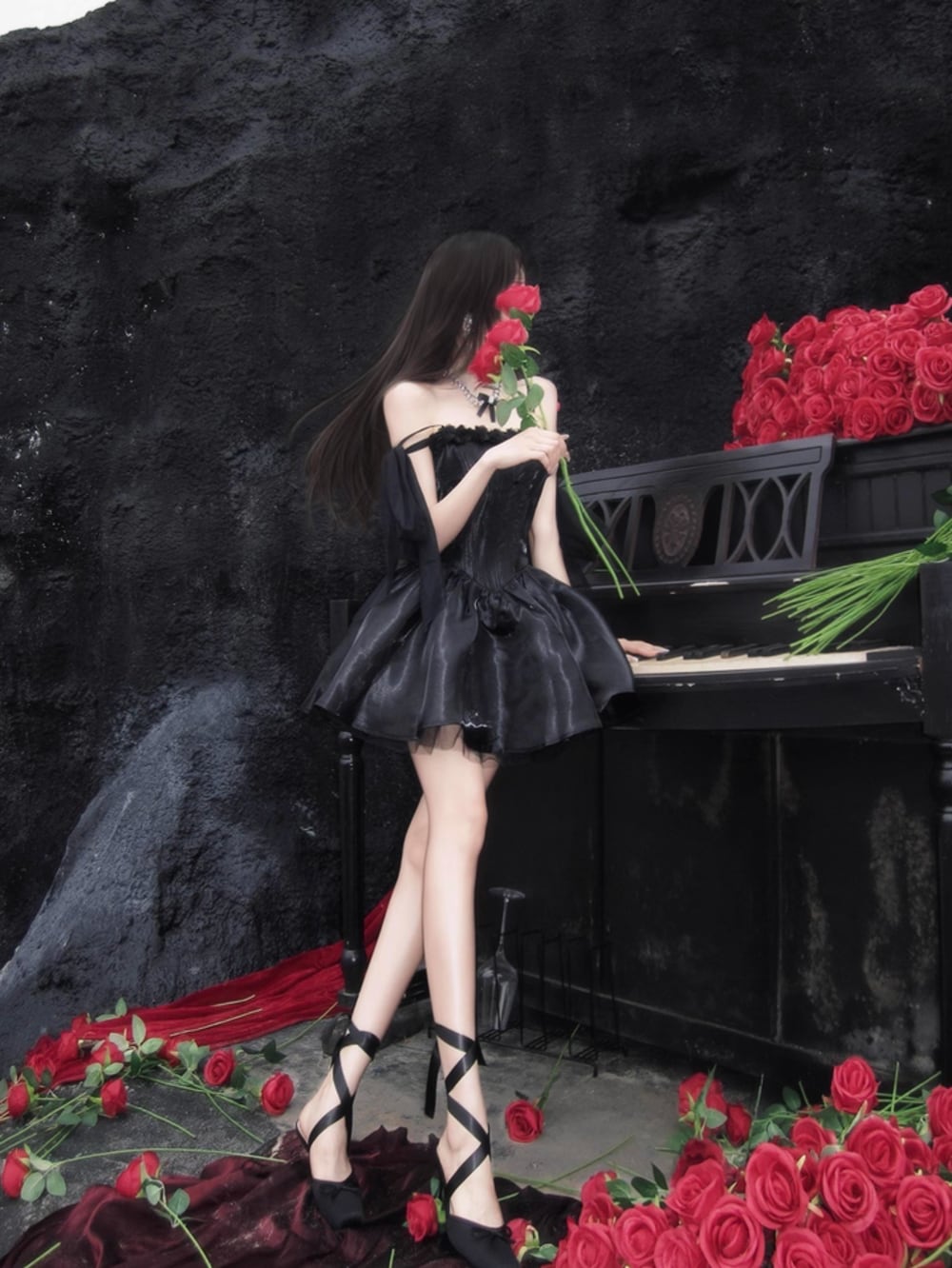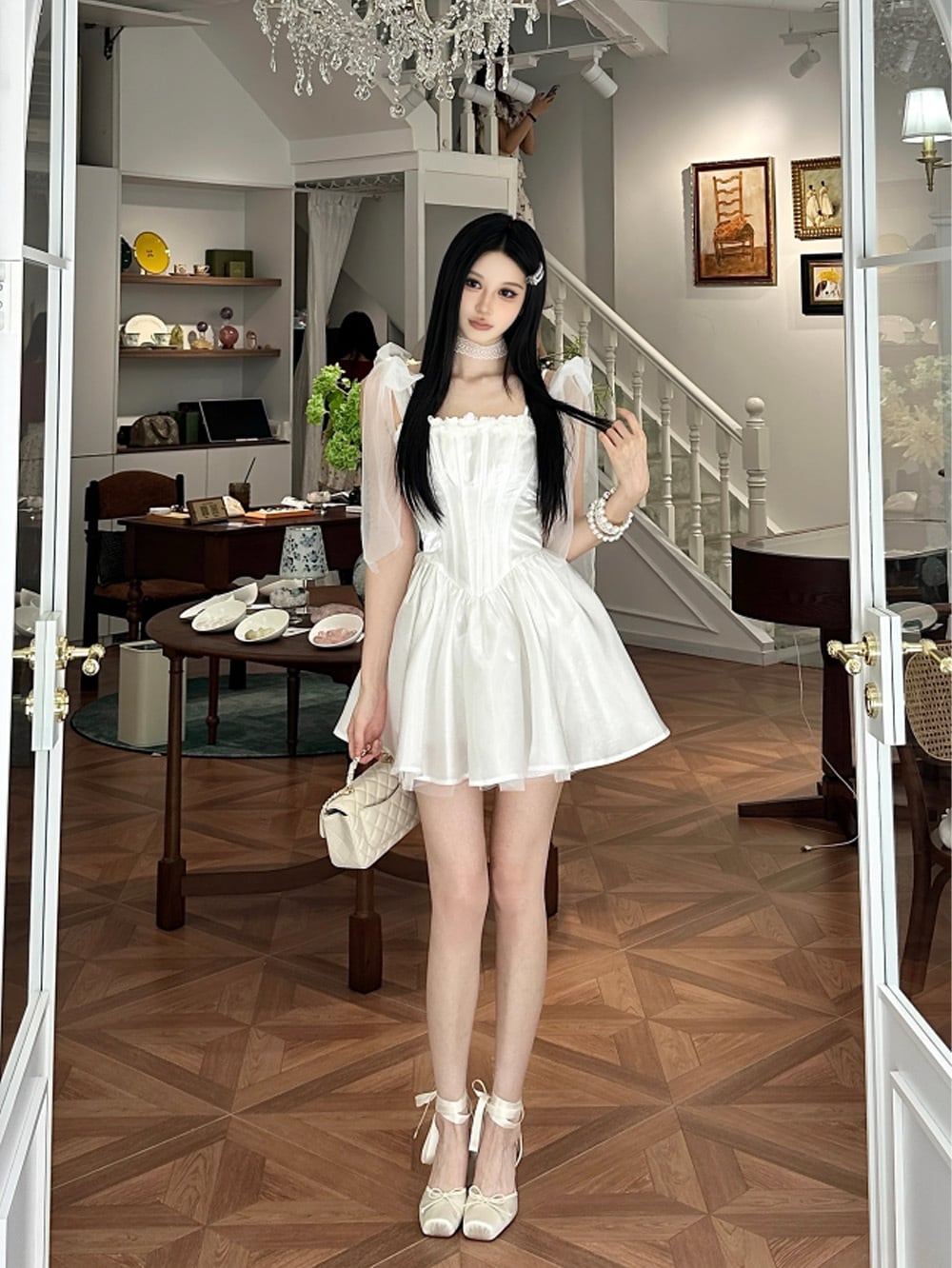肩をふんわり包むチュールリボンは、まるで天使の羽のように軽やかで、