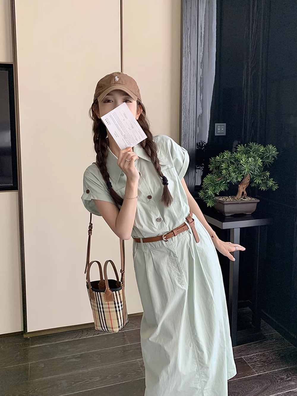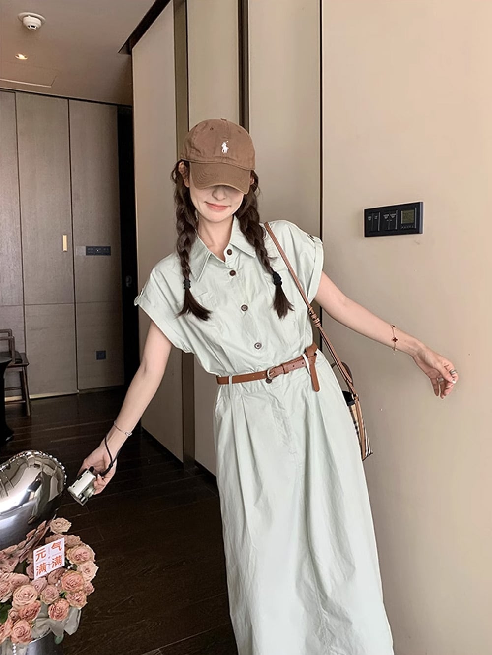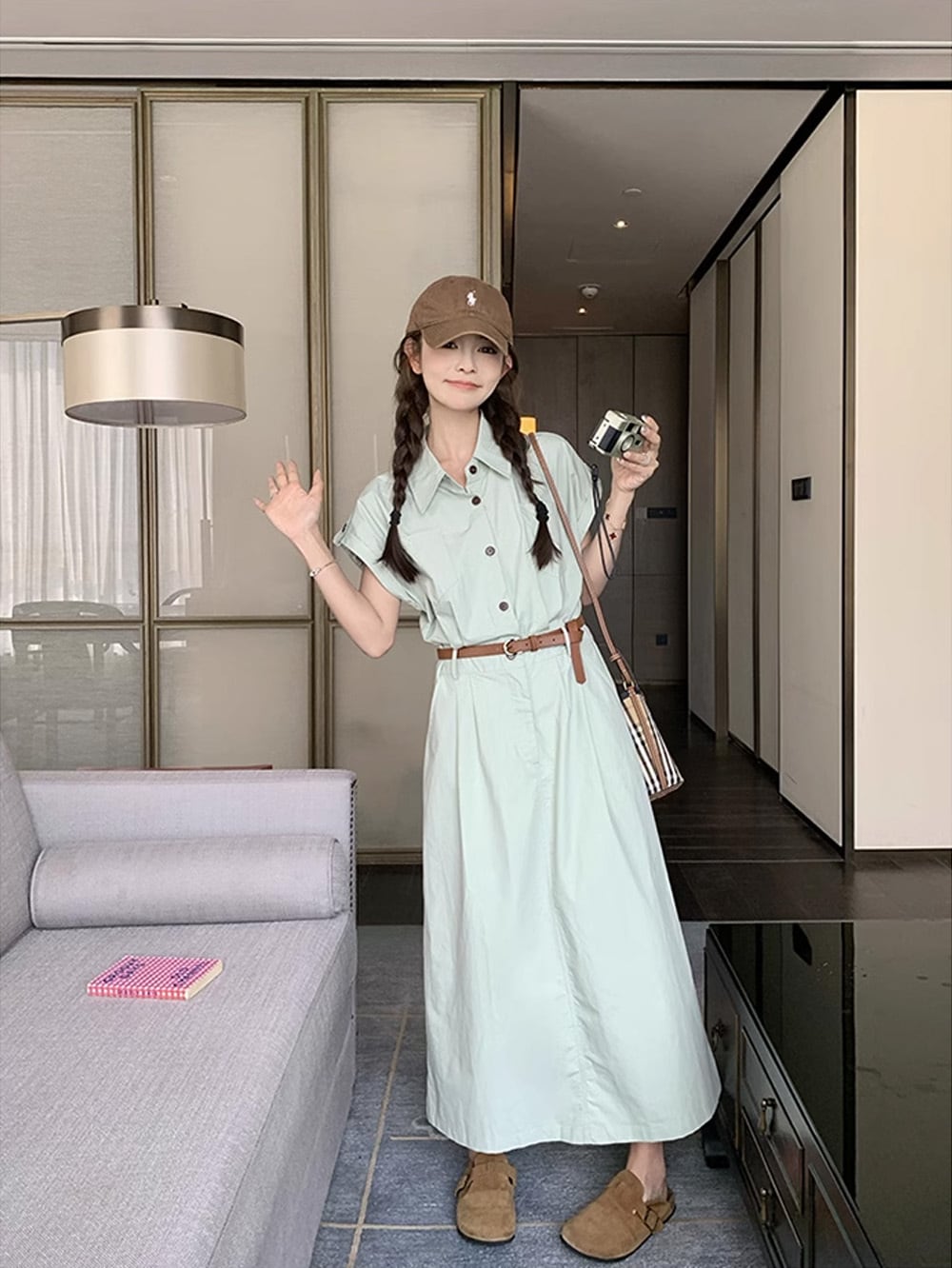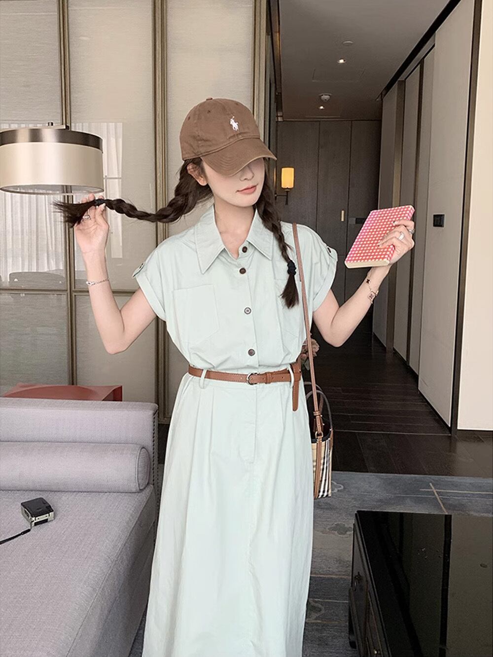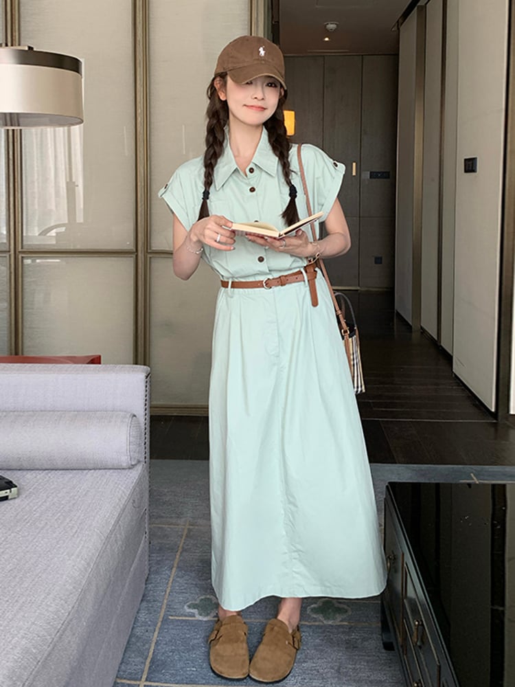ベルテッドくすみブルーボタンワンピース