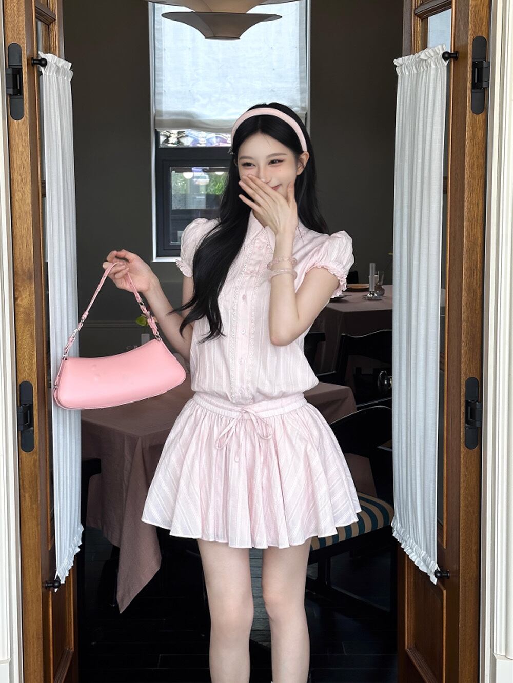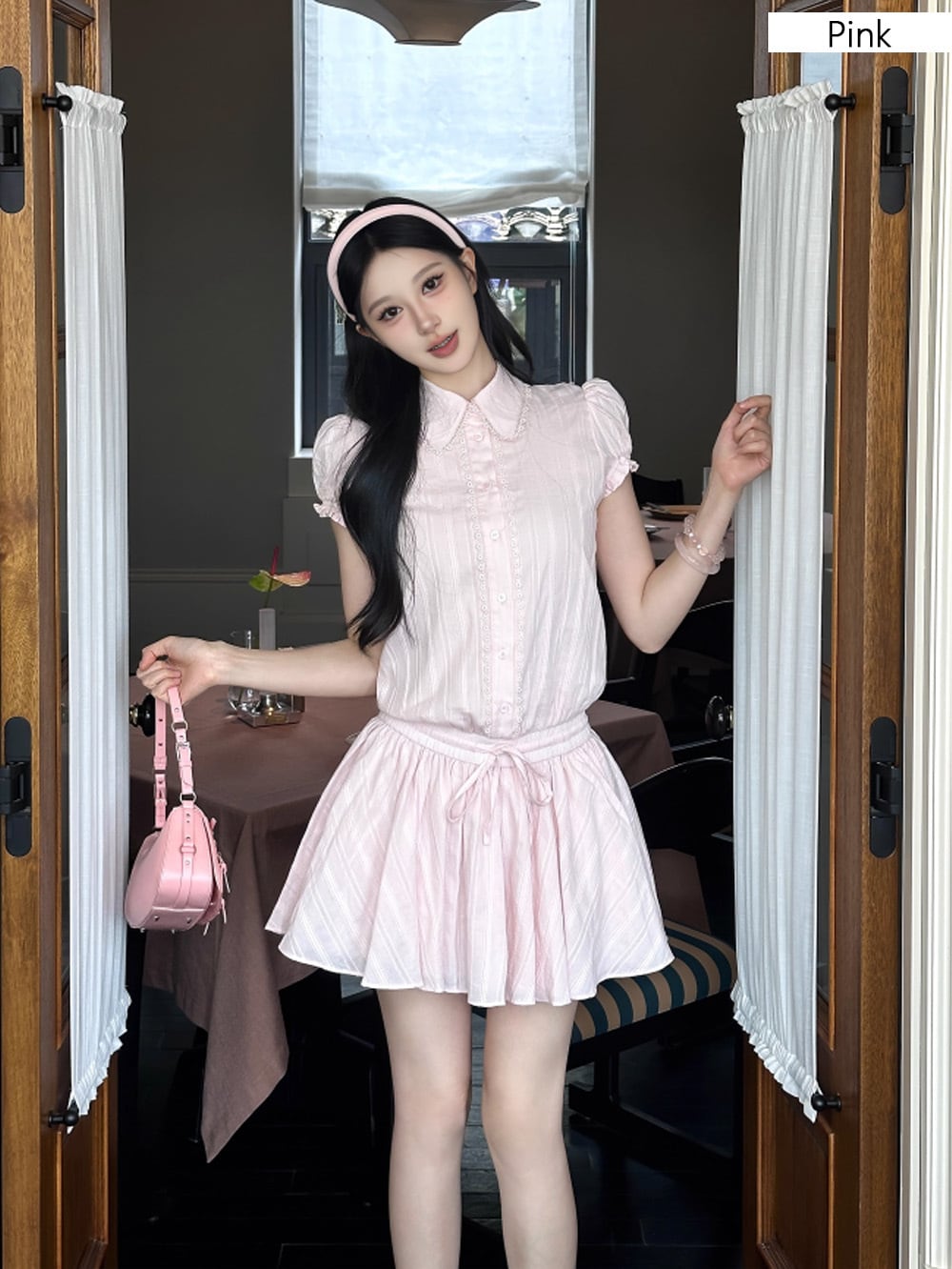 フリル袖とドローストリングのウエストで、シルエットに立体感が生まれ、“甘さの輪郭”をしっかり表現。