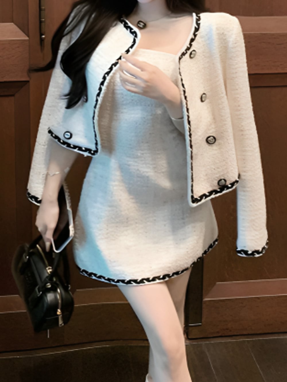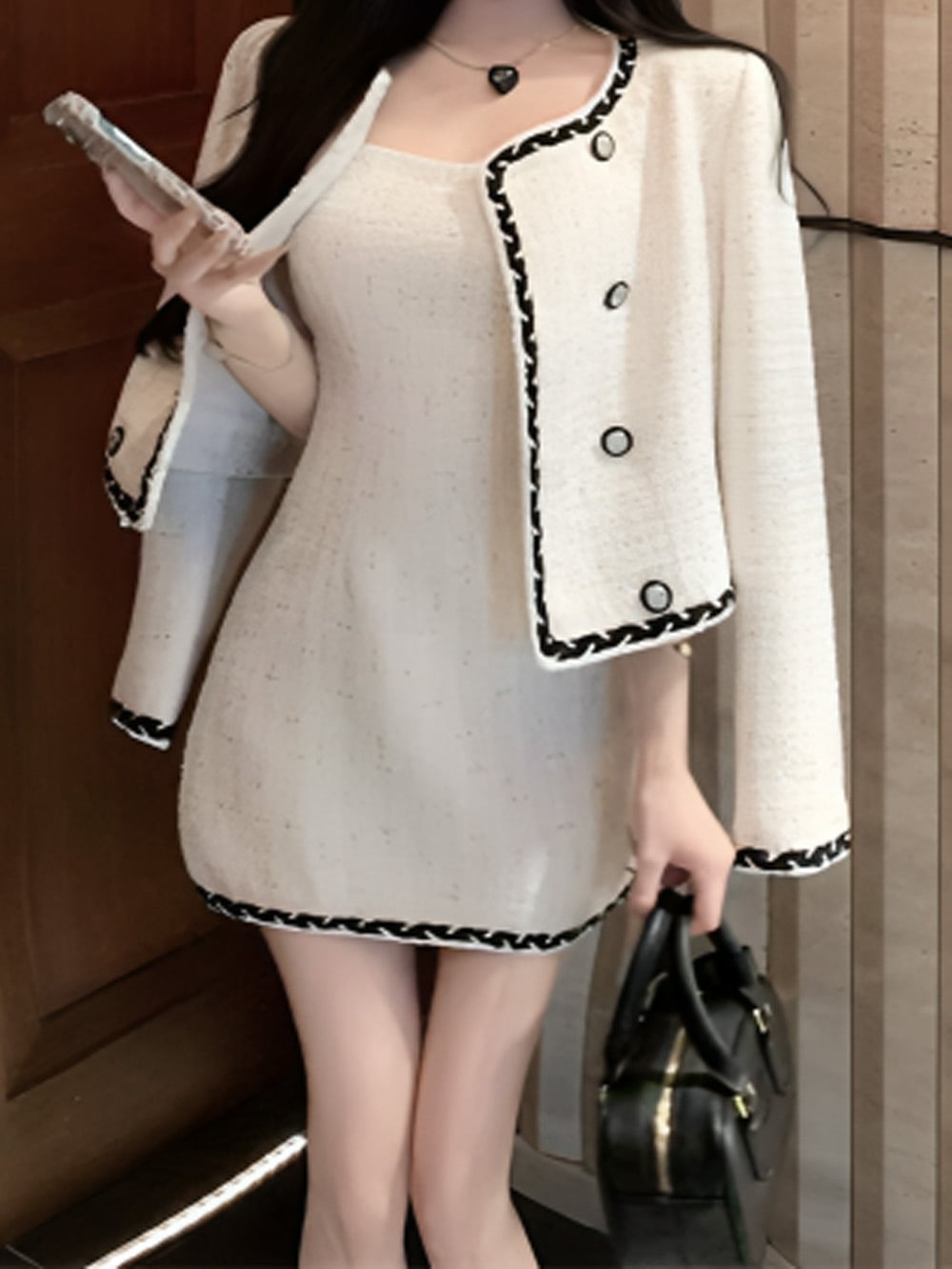 ツイードスタイルチューブワンピース&アウタージャケットは、上品さとトラディショナルな魅力を兼ね備えたアイテムです。